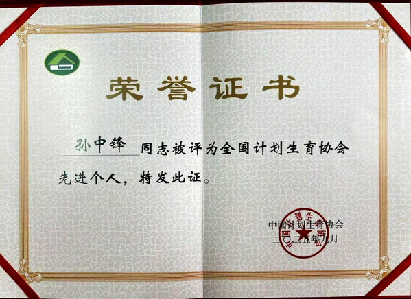 喜讯 | 孙中锋老师荣获全国计划生育协会“先进个人”称号
